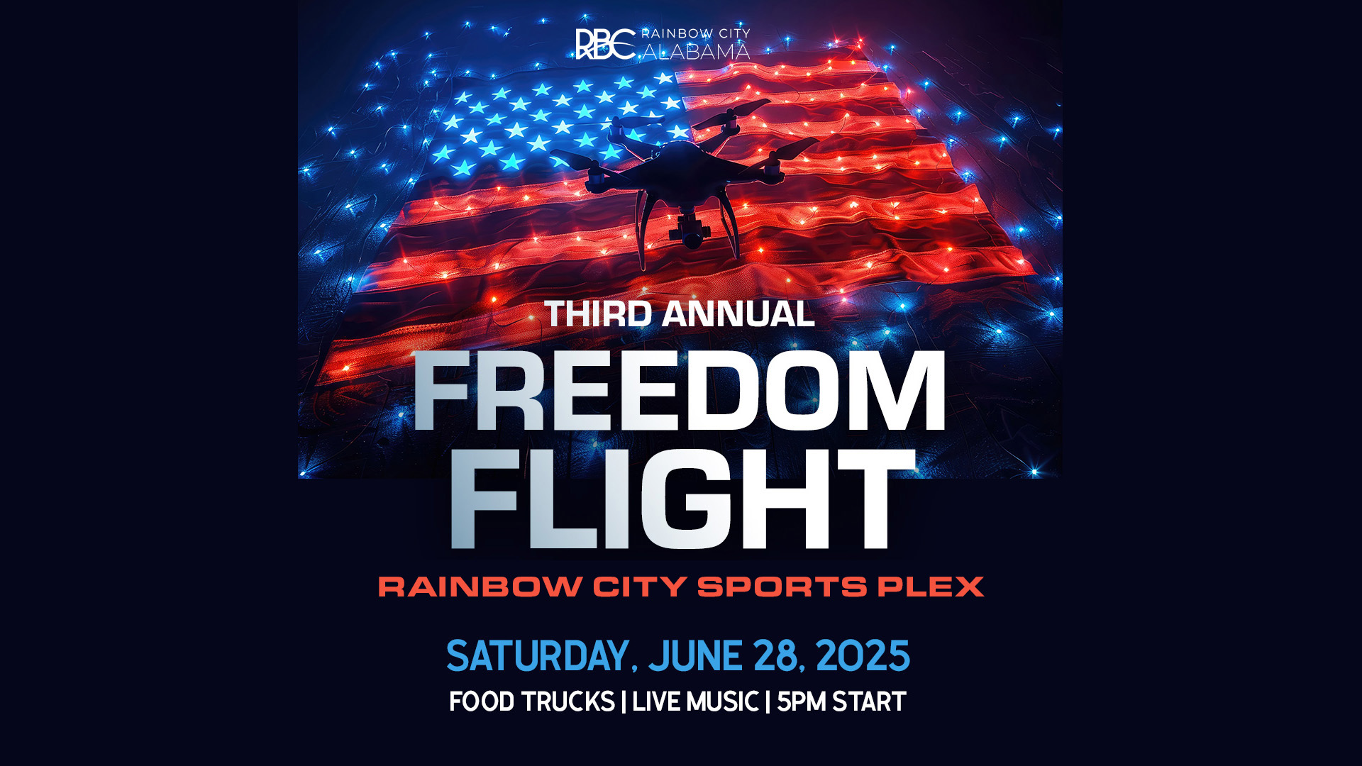 Come see us at the 3rd Annual Freedom Flight Drone show hosted by the City of Rainbow City! This is a free event for the whole family and there will be food trucks, live music, vendor tables and much more! This event will be held Saturday, June 28th at the Rainbow City Sports Complex.