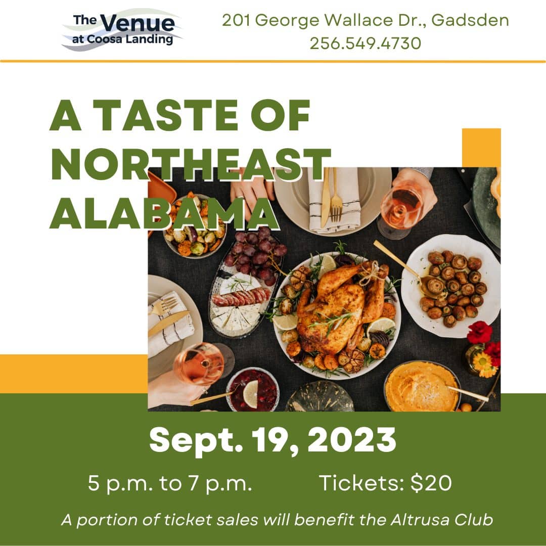 Please join us on September 19th at The Venue for the second annual TASTE OF NORTHEAST ALABAMA!!! The event will take place from 5:00pm-7:00pm and tickets will be $20.00 and may be purchased by phoning 256-549-4730. A portion of each ticket sold will benefit Altrusa of Gadsden. Participating restaurants will be posted on our Facebook page at a later date.
