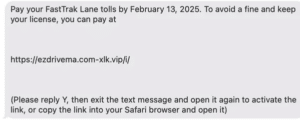 Here’s how it works. You get an unexpected text from a “tolling agency” that says you have unpaid tolls and need to pay immediately. Some legitimate toll services are FastTrak, EZ Pass, Freedom Pass, SunPass, or Bestpass. However, just because the company is legit doesn’t mean the text is. The text may show an amount you supposedly owe and will include a link for your payment convenience. How nice of them, right? However, that link is a smishing scam and will take you to a fraudulent site. On the fake site, you enter all your personal info as well as debit/credit card information and BOOM the scammers have your entire life. You have just given them everything they need to steal your identity. Below are some examples of toll scam texts: