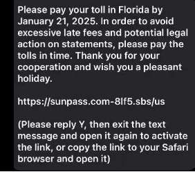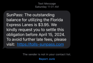 Here’s how it works. You get an unexpected text from a “tolling agency” that says you have unpaid tolls and need to pay immediately. Some legitimate toll services are FastTrak, EZ Pass, Freedom Pass, SunPass, or Bestpass. However, just because the company is legit doesn’t mean the text is. The text may show an amount you supposedly owe and will include a link for your payment convenience. How nice of them, right? However, that link is a smishing scam and will take you to a fraudulent site. On the fake site, you enter all your personal info as well as debit/credit card information and BOOM the scammers have your entire life. You have just given them everything they need to steal your identity. Below are some examples of toll scam texts: